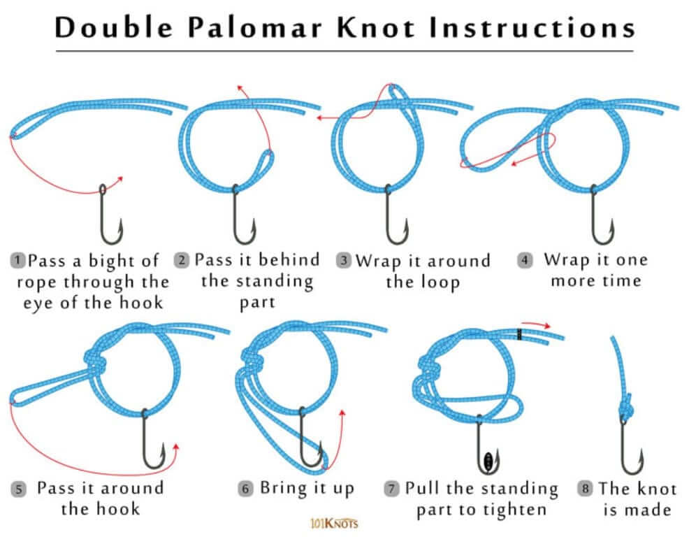 Первый узел на крючок нашего обзора Паломар. Он один из самых популярных среди рыбаков, ввиду универсальности. Применяют для крепления к леске или плетенке крючков, мушек и фидера. Его можно использовать и для присоединения поводка, но нужен вертлюг.