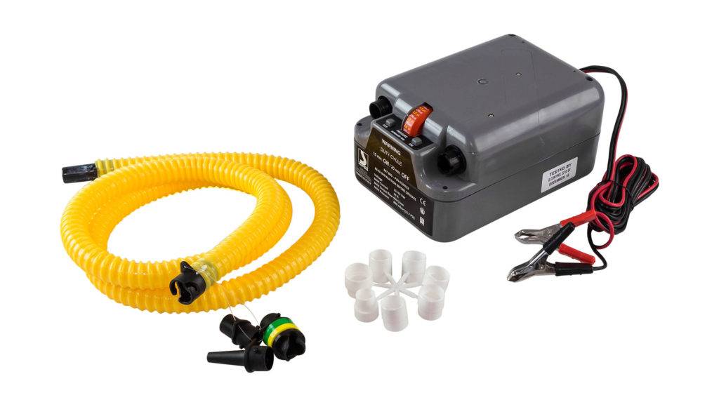Насос для надувной лодки комплектуется воздушным шлангом длиной 3 м, электрическими проводами с зажимами для подсоединения к аккумулятору и комплектом переходников для воздушного клапана. Весь комплект хранится в чехле, выполненном из водостойкой ткани. Электрический насос оборудован двумя патрубками – нагнетательным и всасывающим. Последний может использоваться для опорожнения баллонов, при подготовке лодки к транспортировке. Компрессор снабжен регулируемым реле давления. Характеристика параметра задается вручную пользователем. При достижении уставки размыкаются контакты в цепи питания электродвигателя. Это позволит избежать накачки баллонов выше допустимых величин давления.