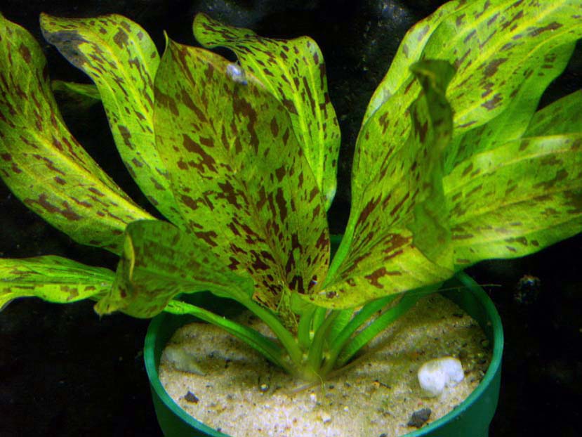 Этот эхинодорус выведен искусственно, в дикой природе его нет. Куст компактный, низкорослый с красно-коричневыми пятна.