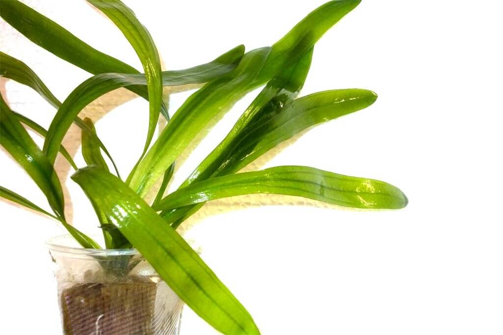 Эхинодорус узколистный – получил описание в 1975 году. Природная среда обитания – Мату Гроссо, Бразилия. Отличается выносливостью и теплолюбивостью. Имеет простой внешний вид, листья длинные и заостренные кверху, зеленого цвета. При неправильных условиях содержания листовые пластины могут пожелтеть. Рекомендуется высаживать за средний и задний план. Куст вырастает высотой 50-60 см, ширина листа – 4 мм. В аквариуме может прижиться в воде слабокислой и жесткой. Теплолюбивый вид, требуемая температура содержания: 20-30 градусов по Цельсию. Подходит в качестве укрытия для мелких рыбок. Для стремительного роста требуется количество светового дня 10-12 часов, при свете ЛБ лампами 0,4 Вт на 1 литр воды. Высаживать узколистный эхинодорус лучше в просторный аквариум, поскольку сильно разрастается.