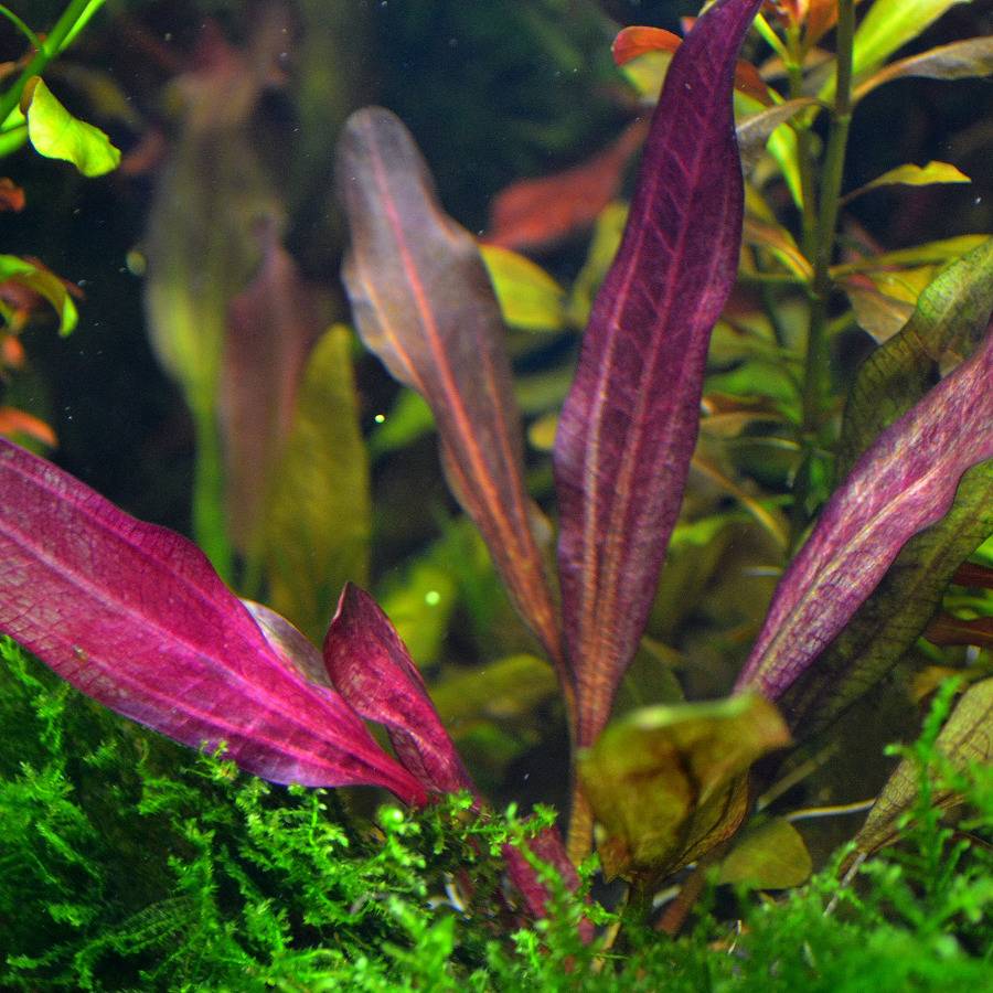 Эхинодорус рубин – популярное декоративное растение яркого окраса. В отличие от собратий природного происхождения, очень выносливое даже в кислой и мягкой воде, не предъявляет особых требований к содержанию. В качестве субстрата для посадки подходит непромытый песок, где он чувствует себя комфортно. Разрастается до высоты 60 см, листья продолговатые, пурпурно-красные, по 8-10 мутовок в одной розетке. Допустимая температура содержания в аквариуме: от 22 до 30 градусов.