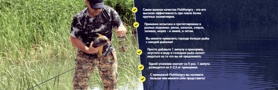 На официальном сайте об активаторе клёва Fishhungry (голодная рыба) отзывы выглядят очень привлекательно. Некоторые высказывания утверждают, что продукт действуют на рыбу, как валерьянка на кошку. Если неподалёку от места вашей рыбалки есть рыба, Fishhungry привлечет её. Приманка активирует аппетит у рыбы, заставляя её глотать любую наживку. Независимо от того, зима на улице или лето, жители водоёма приплывут на место вашей ловли.