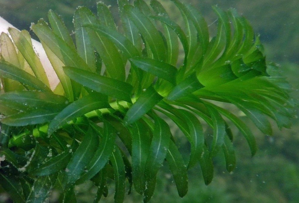Элодея курчавая (Elodea crispa). Это вид часто путают с курчавым лагаросифоном. Но по сравнению с последним она более теплолюбива, требовательна к уходу и чаще цветет. Жесткие стебли растения покрыты близко расположенными друг к другу зубчатыми изумрудными листиками.