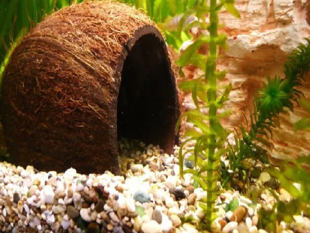 Аквариум желательно снабдить различными укрытиями из камешков, коряг, керамических деталей, скорлупы кокосов.