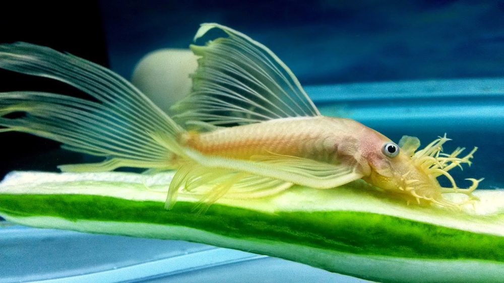 Корм может быть разный, и живой, и сухой, и растительный. Однако следует учитывать, что анциструсы – это, в первую очередь, «вегетарианцы», а потому им нужна пища растительного происхождения. Ежедневно, на ночь, можно давать специальные зеленые таблетки от производителей вроде «Аквариус» или «Тетра». Однако также периодически этим питомцам можно давать и просто овощи. Подойдут кабачки, тыква, огурцы, капуста и т.д. Кусок или лист предварительно ошпаривается кипятком, а затем накалывается на вилку и кидается в воду. Но не стоит бросать слишком много овощей, так как, если сомы их быстро не съедят, то они создадут оптимальные условия для размножения инфузории. Возникнет бактериальная вспышка и вода помутнеет. В таком случае нужно извлечь кусок из аквариума и подождать пару дней, когда инфузория из-за отсутствия пищи сама исчезнет;