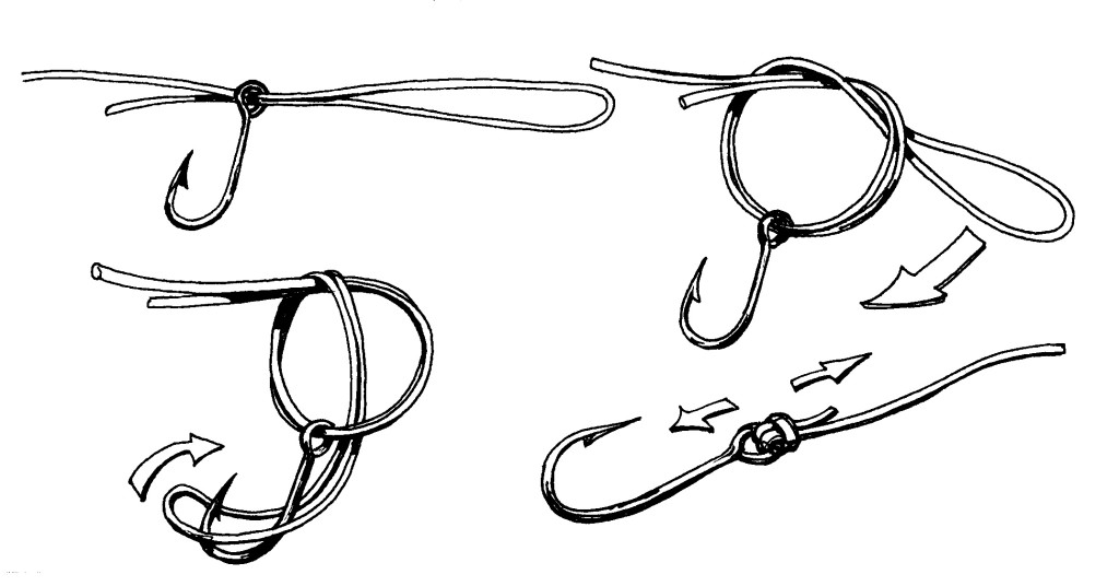 Черепаший — этот способ не стоит применять для монофольной лески, так как может привести к развязыванию узла в самый неподходящий момент, лучше такой способ использовать для плетёной лески. Способ достаточно простой, для этого надо продеть кончик лески через крепёжное отверстие на крючке, далее сделать один раз петлю и завязать узел. После чего крючок протаскиваем через сделанную петлю и снова затягиваем. Такой способ очень надёжен даже при самых максимальных нагрузках что обеспечивает надёжность поимки рыбы.
