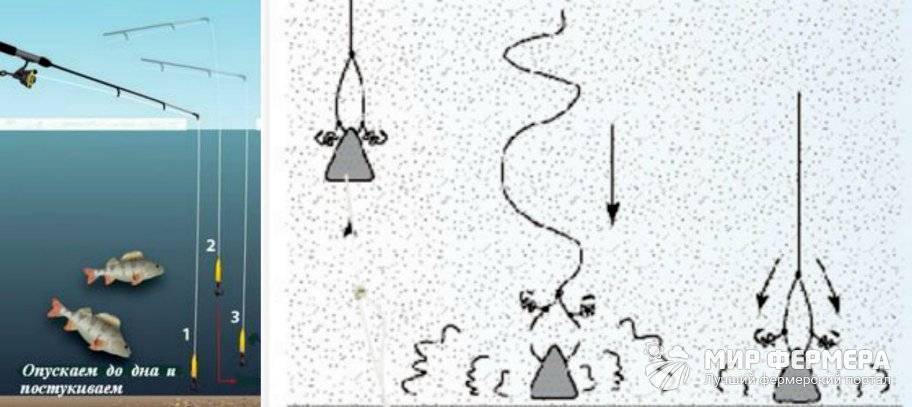 Процесс данной рыбалки довольно прост. В классическом варианте снасть опускается на самое дно водоема и резким движением поднимается на 15–20 см. Через несколько секунд поднятая приманка снова опускается на дно. В результате поднимается небольшое облако мути, которое притягивает хищника. Увидев в нем яркий движущийся предмет, окунь думает, что нашел свою естественную добычу и попадается на один из крючков.
