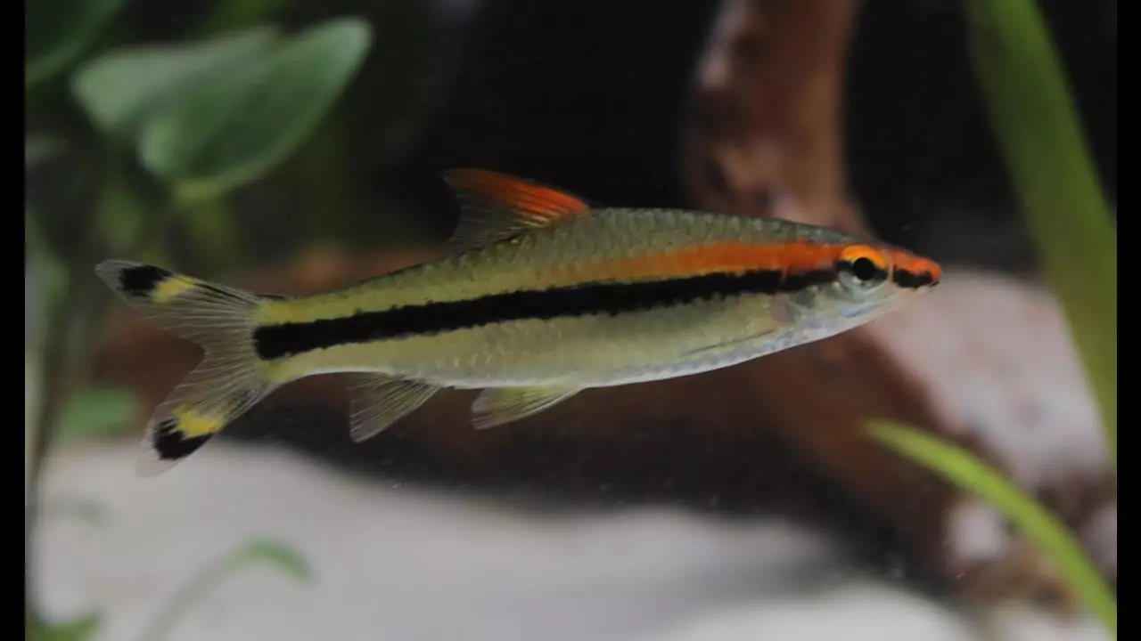 Окраска. Основной цвет крупной чешуи серебристый, по всей боковой стороне корпуса — от рта и до хвоста, даже через глаза — проходит яркая черная полоса. Сразу над ней тоже от края рта и примерно до середины спинного плавника параллельно идет красная или оранжевая полоска. Эти полосы как раз и являются основным характерным отличием вида.