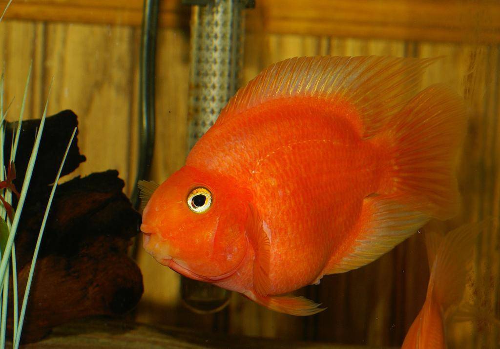 Название говорит за себя – рыбка ярко красного, даже оранжевого цвета, иногда желтого. Рыбка может быть крупной, и вырастать до 20 сантиметров и более, поэтому позаботьтесь об объеме вашего аквариума.