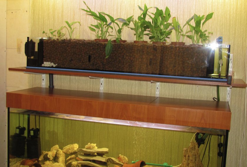 Очистной механизм, в основе которого заложены способности комнатных растений поглощать вредные для аквариумных рыбок выделения, называют фитофильтром. Внешне это приспособление представляет собой ёмкость с домашними цветами, что устанавливается над аквариумом таким образом, чтобы корни растений доставали до воды.