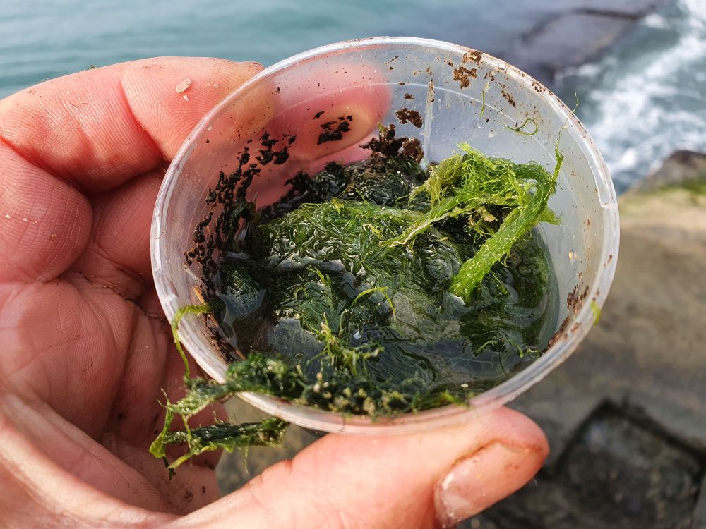 Расскажу теперь о популярной приманке. Крупного зубаря сочинские рыбаки ловят на траву. Случаются, конечно, поимки трофеев и на другие приманки, но трава в этом вопросе – в абсолютном приоритете. И когда приходишь на перспективное место, нужно собрать с бетонных плит волнореза или буны, точнее – с заливаемых водой их участков, нужной травы насыщенного темно-зеленого цвета с не слишком жёсткой структурой. Фактически – это нитевидные водоросли. Главное, чтобы эта трава была достаточно длинная – не короче 5 см.