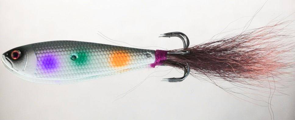 В этой приманке есть одна конструктивная хитрость. Центр тяжести несколько смещен в сторону, благодаря чему и происходит заваливание тела на бок. В хвостовой части расположен один неподвижный тройник и опушка из шерстяной кисточки.