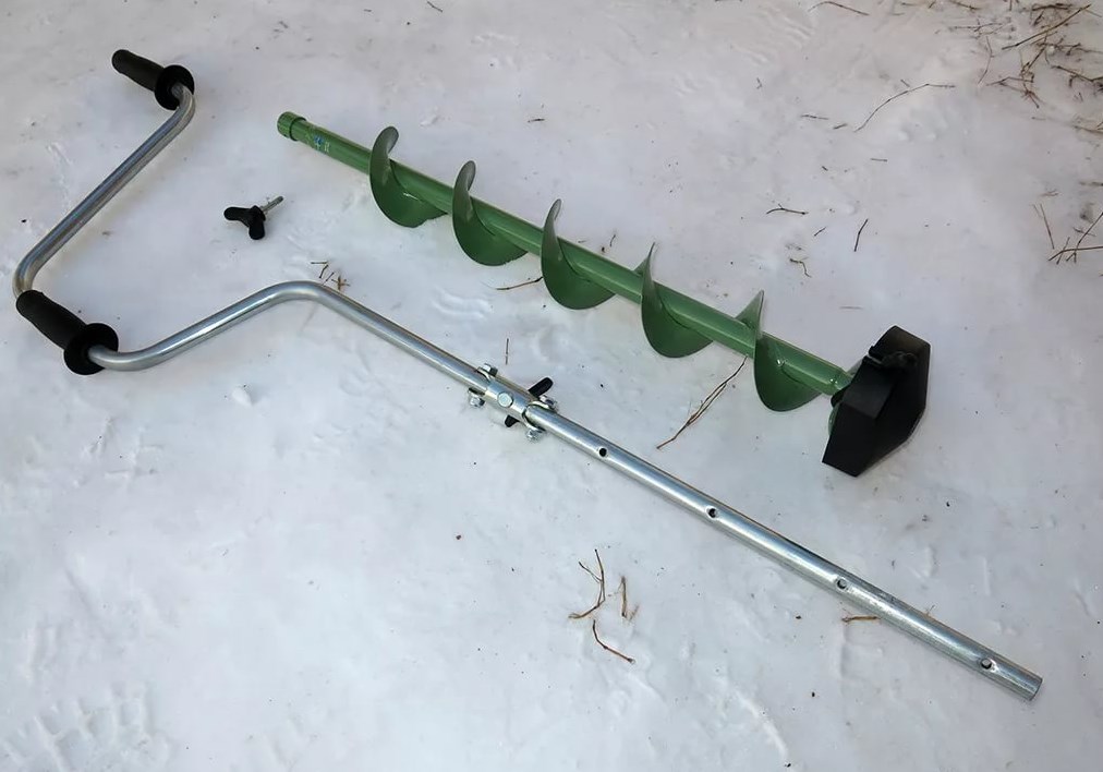 На моторе этого рыбацкого инструмента с двух сторон закреплены рукояти, которые выполняют роль каркаса, а шнек крепится на вал редуктора.