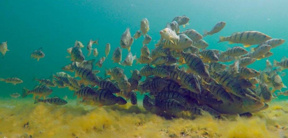 Мелкие окуньки предпочитают держаться вблизи зарослей водной растительности, где легче спрятаться от хищника.