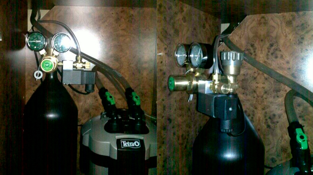 В такой системе источником газа служит баллон со сжиженным CO2. Наиболее сложный вариант, требует штуцерного узла с редуктором для понижения давления и манометрами для контроля давления в баллоне и магистрали. Зато с точки зрения регулировки и управления превосходит любой другой способ – электромагнитный и управляемый игольчатый клапан легко решают все проблемы.