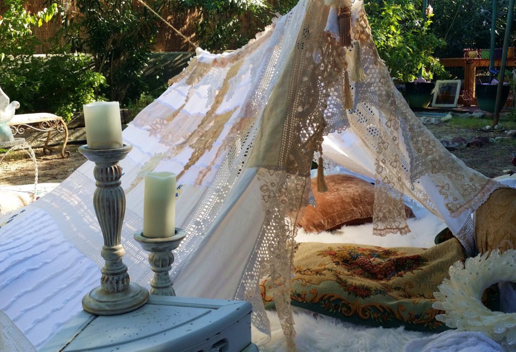 Вы можете придумать свой вариант палатки из шторы. Например – сбить в верхней части 4 доски и накрыть занавеской, получится нечто вроде вигвама.