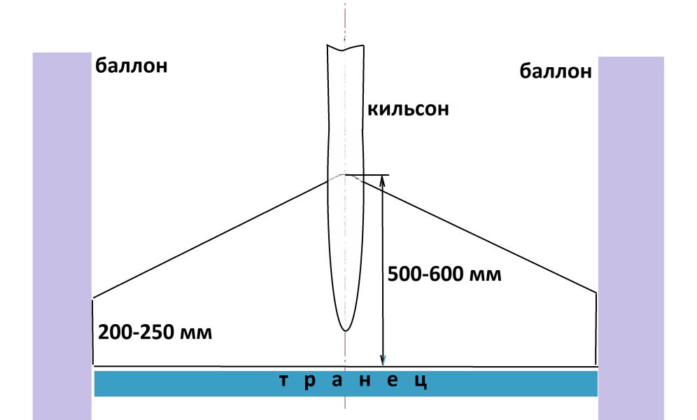 Такую работу можно выполнить и на кухне, имея под руками самый простой набор инструментов. Потребуется лишь снять точные размеры, перенести их на лист картона, вырезать из него шаблон и подогнать строго по месту, без зазоров вдоль шва на баллонах. Я подобные вставки делал из листового стеклопластика толщиной 2 – 3 мм, вырезая «крыло» вот такой формы (фото 6). Данная конструкция подходит для обоих случаев: когда нужно убрать и яму, и бугор перед транцем. Единственным отличием была высота этого «крыла»: для бугра она, как правило, на 200 – 300 мм больше.