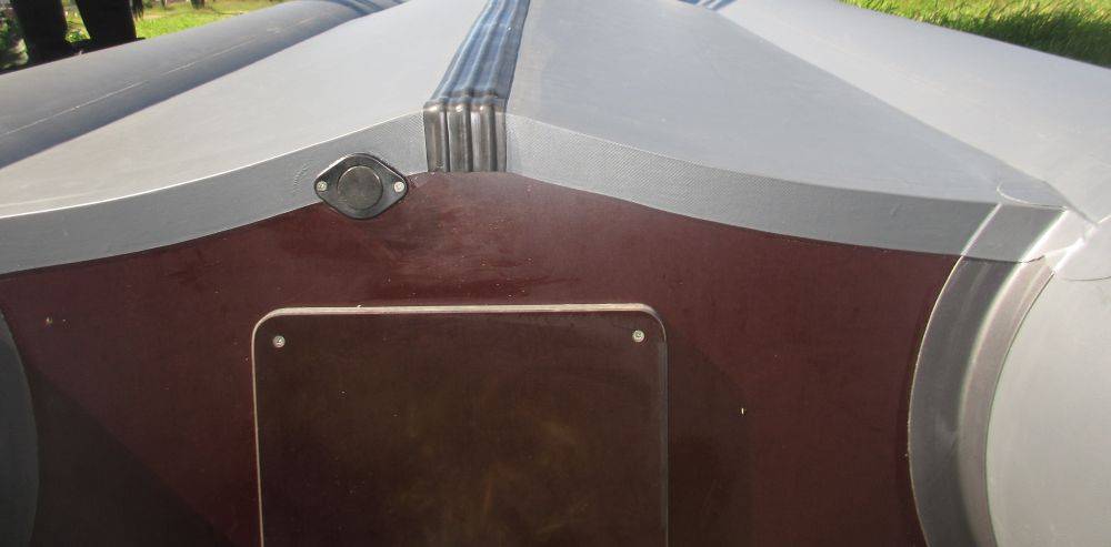 Первым объектом нашего придирчивого осмотра будет надувной кильсон и его монтаж на днищевом полотне. Если производителем вклеен кильсон не по размеру длины днища – более короткий или, наоборот, длинный – перед транцем может образоваться или провал, или горб (а на фото 1 – и то, и другое). При этом на фото представлен не самый яркий пример, иногда бывает и значительно серьезнее. Дефектом это назвать язык не поворачивается, потому как плаванию не особо мешает и на управляемость с безопасностью если и влияет, то несильно.