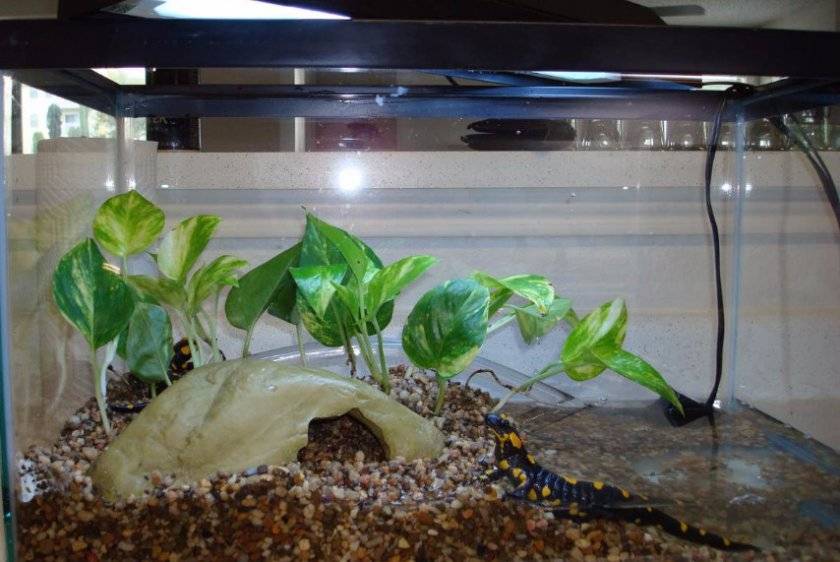 - Идеальный террариум для домашней саламандры содержит коряги, камни и живые посажёные растения.