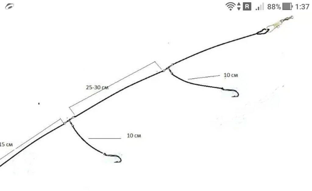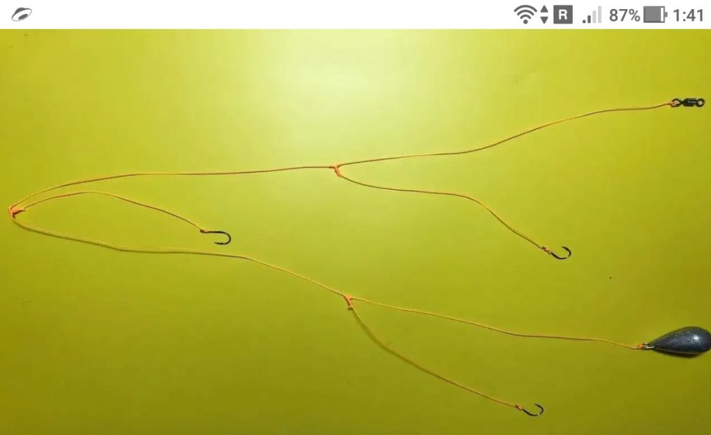 Самым простым способом как сделать крепление поводков при ловле с отводным поводком является привязывание всех трех концов лески (основной шнур, грузовой поводок и поводок с крючком) к одному простому вертлюгу.