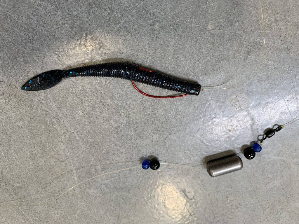 Это оснастка, похожая на предыдущую, с небольшими особенностями. Этот монтаж устроен по принципу разнесенной оснастки, так как груз находится на удалении от 40 см до 1 м от приманки. В данном случае, груз может волочиться по дну создавая муть и привлекая рыбу, а приманка в виде червя находится в свободном состоянии, что приводит к ее характерной игре.