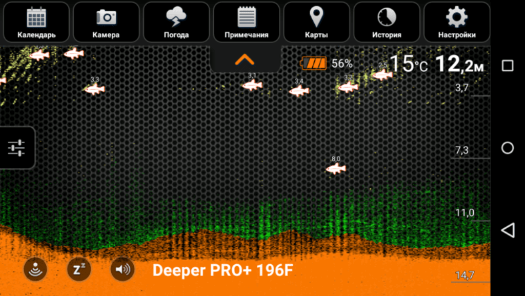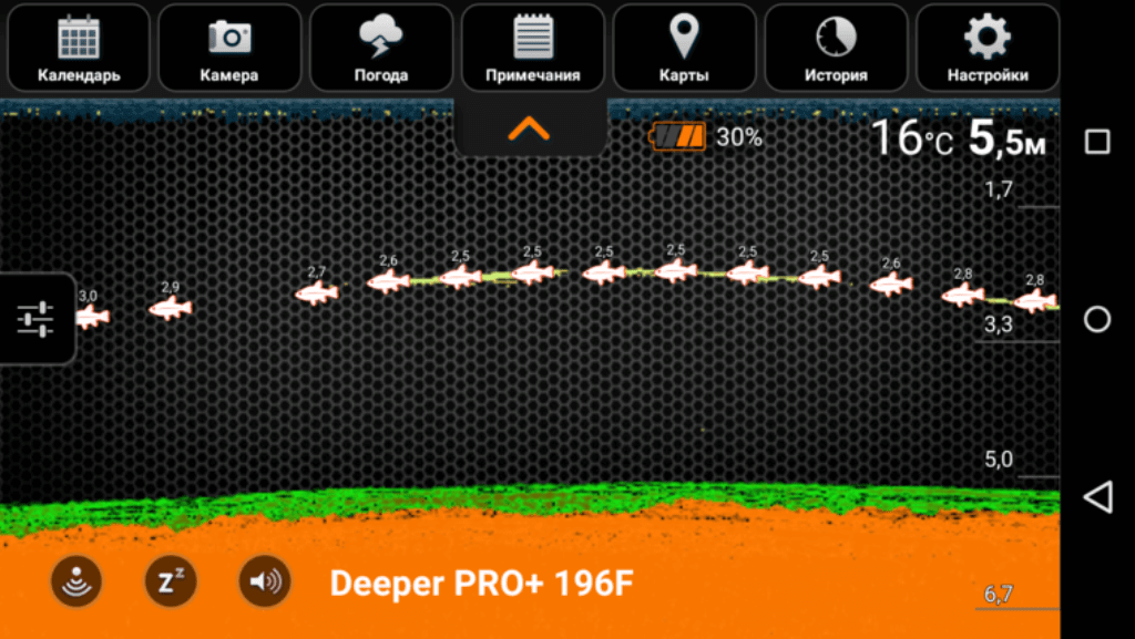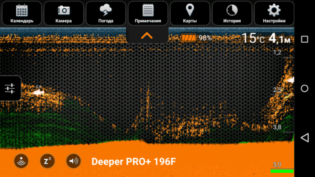 При постоянной работе эхолота, картинка на смартфоне движется справа налево. Позиция справа показывает, что происходит в режиме настоящего времени. Слева – история.