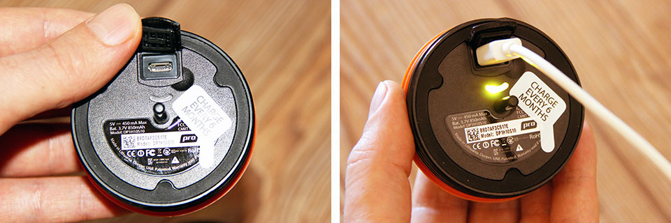 Судя по стикеру на внутренней части «полусферы» эхолота, применять зарядное устройство необходимо с напряжением 5V и током 450 mA, т.е. вполне можно заряжать эхолот от компьютера или другого устройства с USB выходом. Зарядное «гнездо» располагается с внутренней стороны полусферы эхолота под резиновой заглушкой. Шнур для зарядки был в комплекте, но у меня, к сожалению, он потерялся, поэтому заряжаю подходящим шнуром от смартфона. При подключении зарядного устройства на эхолоте начинает мигать светодиод. Как только аккумулятор зарядится, светодиод перестает мигать и светится непрерывно.