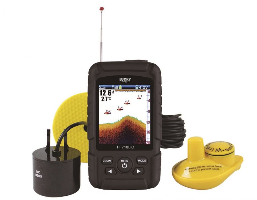- Эхолот ffw718 Wireless: глубина эхолокации 35 м, дальность действия 70 м, в комплекте антенна — увеличивает дальность до 300 м.