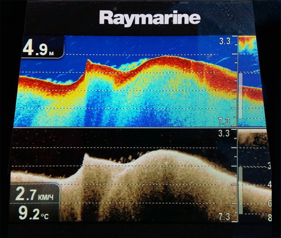 Значительно лучше и информативнее черно-белого. Я неоднократно видел утверждения, что картинка в яркий солнечный день на цветном экране эхолота засвечивается, а на черно-белом нет. Может для каких-то старых эхолотов это было и так, но сейчас делают прекрасные цветные экраны, которые не засвечиваются на солнце, а информативность цветного экрана гораздо выше. Ниже фотография с моего эхолота в солнечный день. Я специально выбрал фото с рыбой у дна. А в конце статьи будет видео, снятое с эхолота в солнечную погоду, вы сами увидите как все прекрасно видно, причем под любым углом к экрану эхолота.