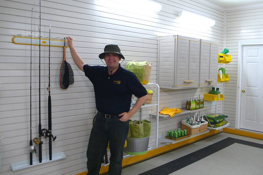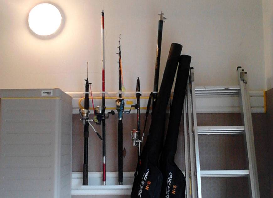 Для хранения удочек, сачков и спиннинга используйте кронштейн для удочек, как это было сделано в выпуске программы «Фазенда» на Первом канале от 7 июня 2015 года, где компания ГаражТек обустроила гараж на 2 машины