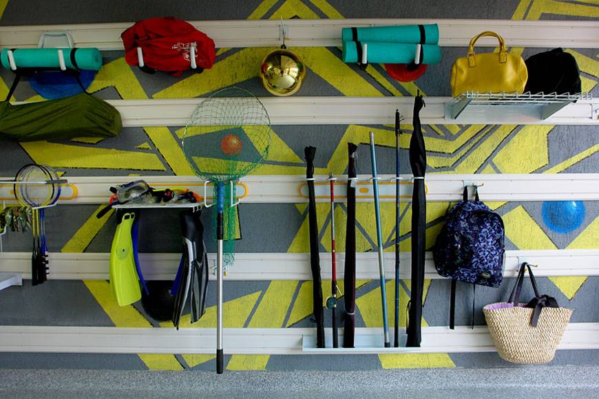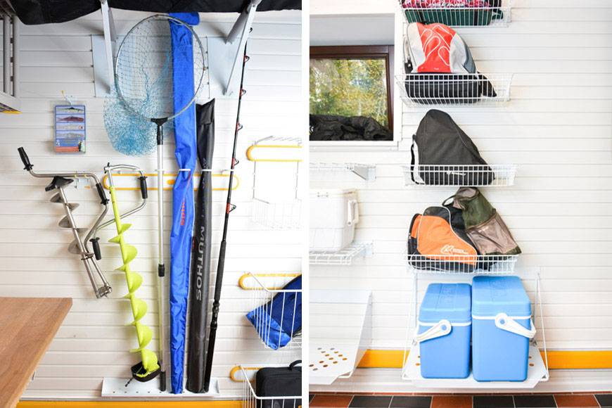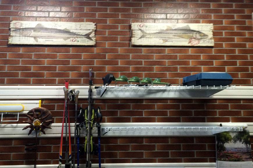 В гараже можно установить не только стеллаж для удочек и инвентаря, но и полки для хранения специализированной одежды: рыболовного костюма или резиновых сапог. Систему хранения легко подстраивать под себя и менять аксессуары в зависимости от сезона.