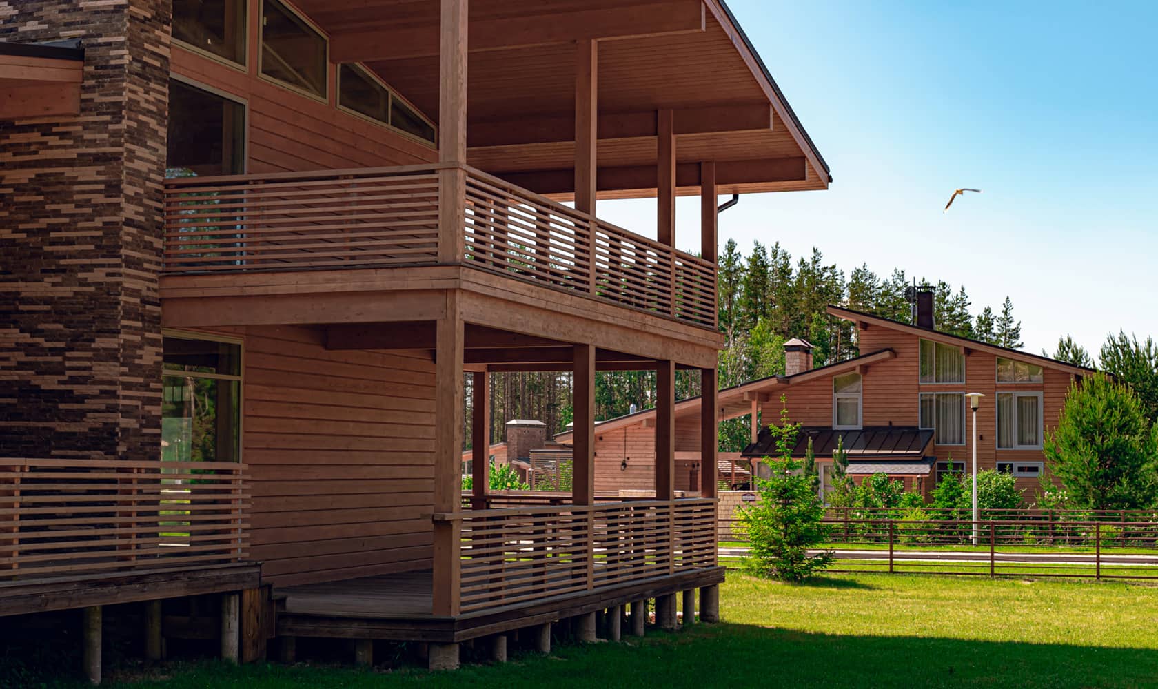 Коттеджи выполнены из клееного бруса – одного из качественных и долговечных материалов с высокими теплоизоляционными свойствами. Благодаря специальной обработке, брус имеет высокий уровень огнестойкости. Также клеенный брус не дает усадки, поэтому отделку помещений можно начинать сразу по окончанию строительства.