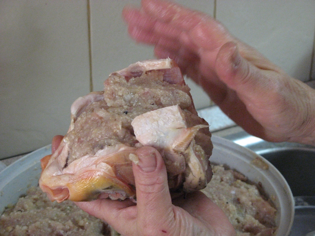 - Фаршировать будем подготовленным фаршем не очень плотно, чтобы во время запекания не порвалась шкурка.