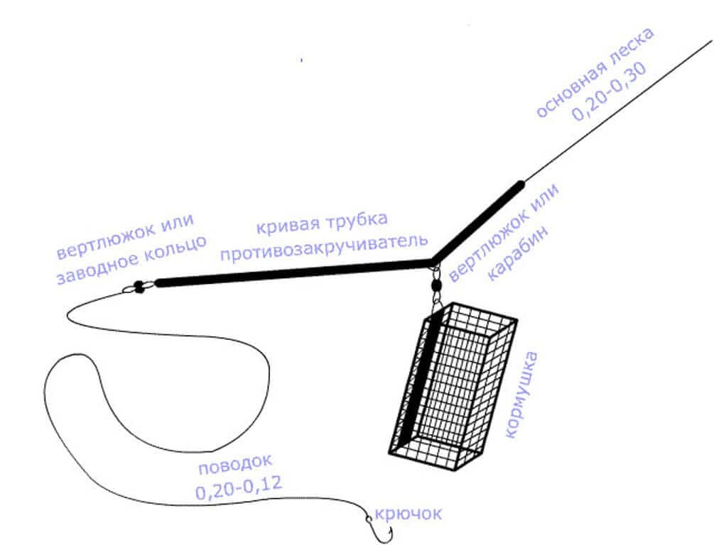 Сначала делаем небольшую двойную петлю на основной леске (в случаи с плетенкой, тройную), к ней крепим повадок, затем через 15 см вяжем петельку (скрутку), длиною 10 см. К этой же петельке используя карабин, крепим и кормушку. Для того чтоб снасть не путалась длина петли к которой крепится кормушка должна быть минимум на 5 см меньше, чем отвод для повадка. Чтоб уменьшить количество перехлестов, первые десять сантиметров поводка будут скруткой. Длина повадка 0,3-1 м. Если клев активный тогда 0,3 м, если пассивный то 70-100 мм. Подходит как для ловли на стоячем водоеме, так и на течении.