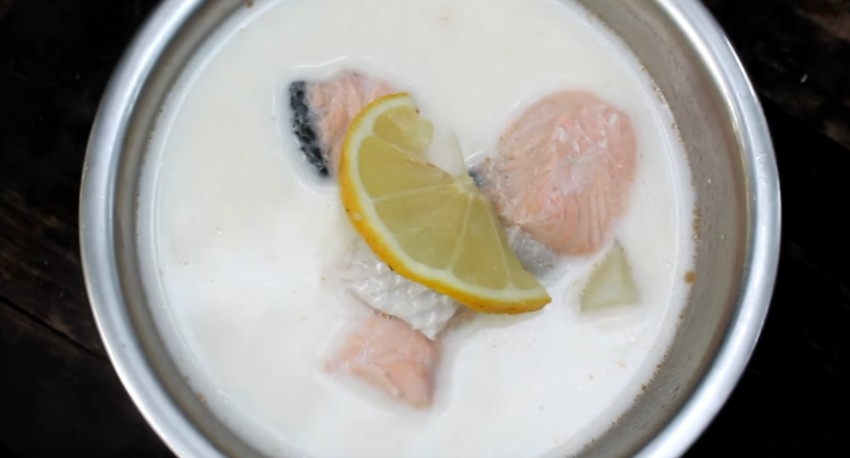 Положить в бульон лосось и залить сливками. Довести до кипения и снять с огня. Настоять 10 минут.