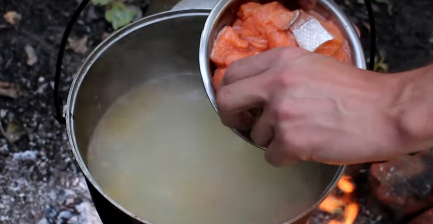 - Через 5 минут после закипания заложить рыбу, посолить. Варить 10 минут.