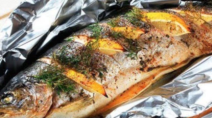 - Плотно оберните рыбу фольгой, затем можете начинать запекать при температуре 180 градусов.