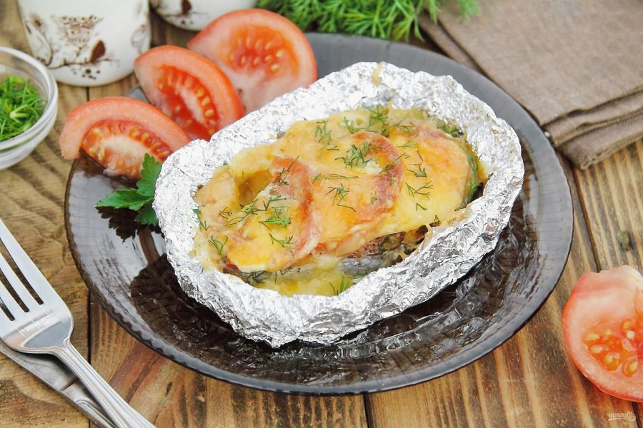 - Дно формы застелить фольгой и промазать маслом. Разместить кусочки рыбы и посолить по вкусу. Сверху положить помидоры, которые присыпать слегка солью. По поверхности помидор равномерно распределить сырный состав и присыпать специями.