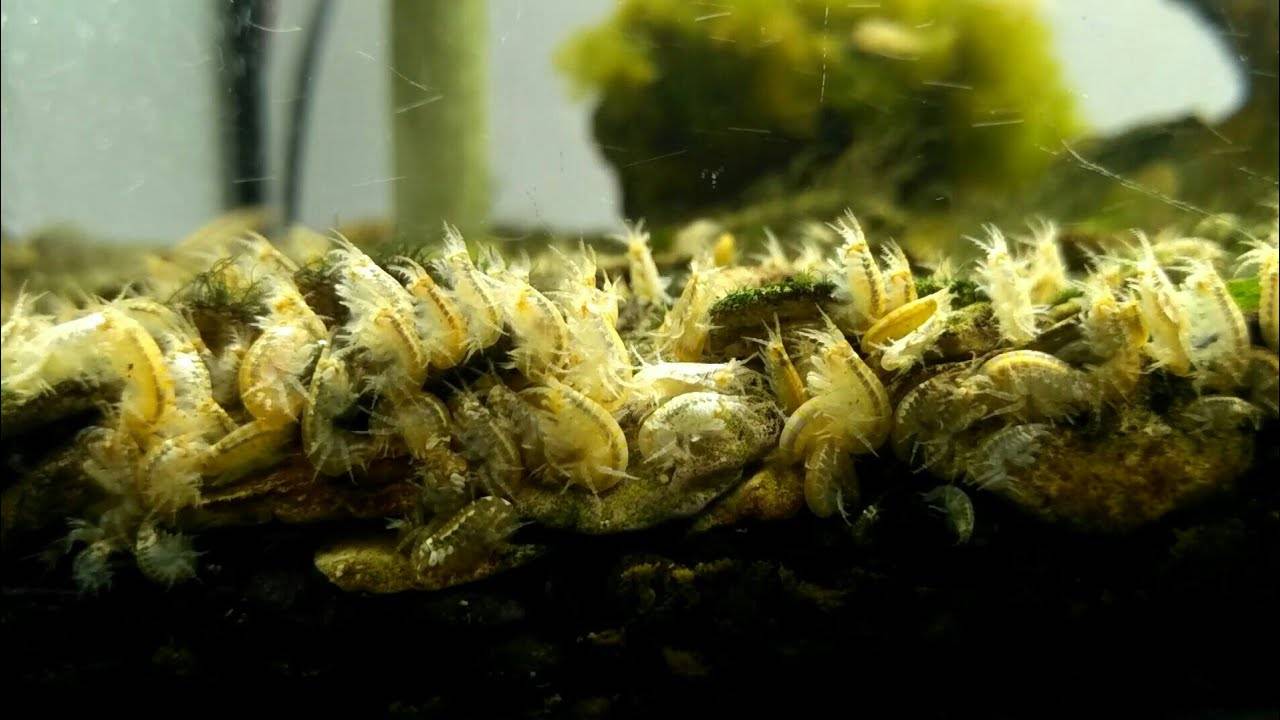 Из обычных аквариумных растений подойдёт яванский мох, риччия или другая узколистная зелень. Дополнительно можно подкармливать гаммаруса мороженым мотылём и хлебной крошкой раз в 2 дня.