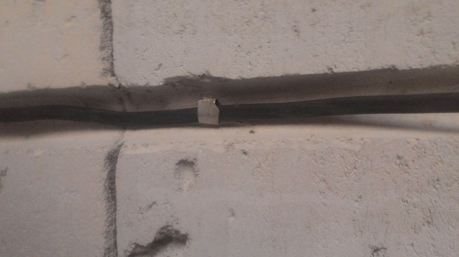 В готовые ниши и штробы теперь можно укладывать кабель. Там, где кабель выпадает, до оштукатуривания его можно закрепить самодельными хомутиками из тонкой жести, которые мы вырезали на этапе подготовки инструмента.