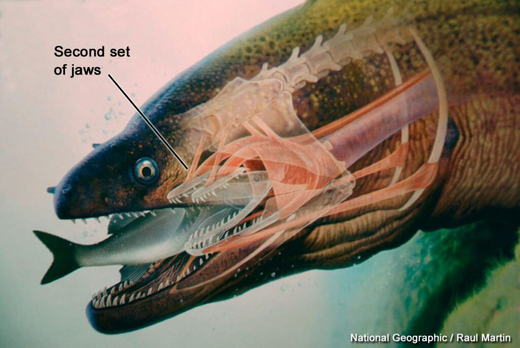 У гигантской мурены есть вторые челюсти, которые образуют систему двойного капкана: когда рыба основной пастью хватает жертву, из глубины глотки вырывается второй челюстной механизм и ещё крепче вцепляется в добычу, калеча её и зажимая.