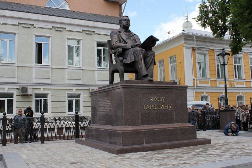 Преуспевающий фабрикант Я.П. Гарелин – основатель первых российских мануфактур, успел сделать очень многое для Иваново-Вознесенска за 9 лет пребывания городским головой. В этот период здесь появились благоустроенные улицы с газовыми фонарями, начались работы по планировке городского сада, стала работать библиотека, открылось училище. К 140-летию Иванова в городе появился памятник общественному деятелю и щедрому меценату. Бронзовое изваяние Гарелина помещено на постамент. Городской голова изображен восседающим в кресле со свитком в руке.