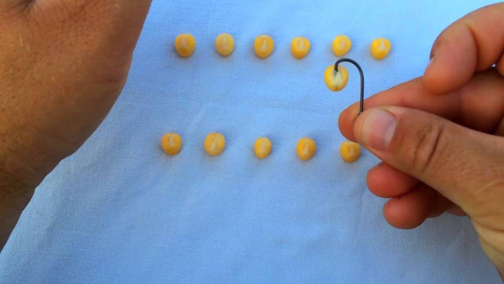 На каждой горошине имеется небольшое пятнышко. Вот в него и нужно продевать жало крючка. Такой способ насаживания отличается надежной фиксацией на крючке. После насаживания гороха на крючок, рекомендуется немного сдавить его, чтобы показалась его мякоть.