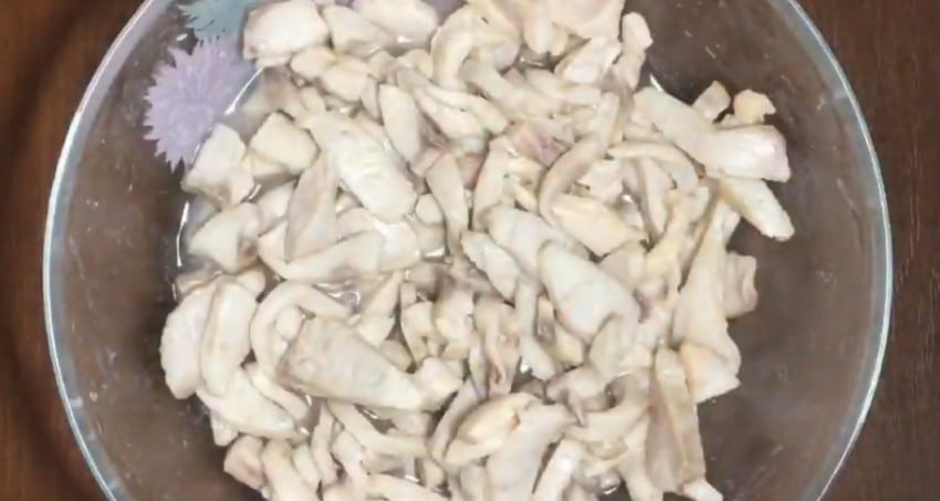- Промываем рыбное филе водой, обсушиваем бумажными салфетками, нарезаем тонкой соломкой, толщина которой не превышает сантиметра. Поливаем рыбу уксусом, оставляем на полчаса.
