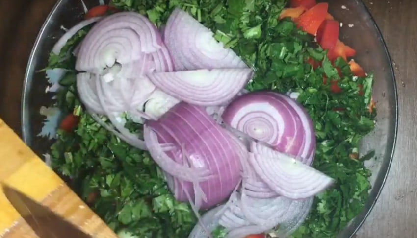 4. Огурцы, перец и оставшийся лук нарежьте средними ломтиками, кинзу мелко нарубите.