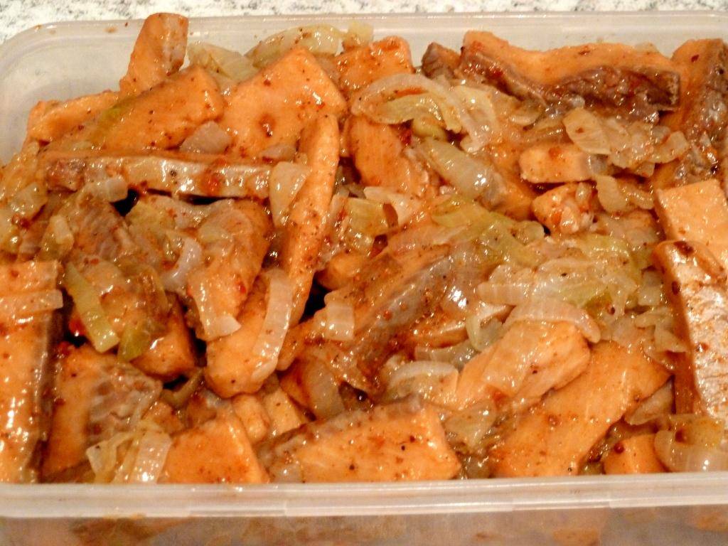 - Надо отделить мясо от позвоночника и удалить все крупные кости. Мелкие кости можно из филе не удалять, так как они должны полностью размягчиться под действием маринада.