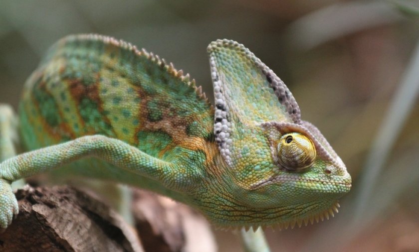 Хамелеоны отличаются необычными органами зрения. Веки чешуйчатого пресмыкающегося сросшиеся и покрывающие постоянно его глаза, но обладающие отверстием для зрачка. При этом правый и левый глаза могут осуществлять несогласованные движения.