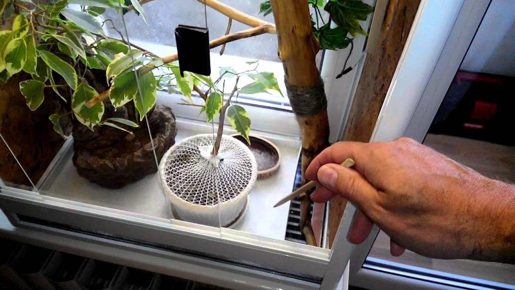 Внутреннюю часть домика следует украсить ветками и различными растениями, где питомец сможет укрываться от посторонних глаз и отдыхать. Но вся конструкция должна быть предельно надежной, хамелеон он не мог повредить себе шкуру или лапки. Идеальным вариантом станет использование фикуса или драцены. Искусственные растения лучше не ставить — на них будет собираться пыль, а проку от них питомцу будет мало. А вот живые цветы будут дополнительно регулировать температуру и влажность в террариуме.
