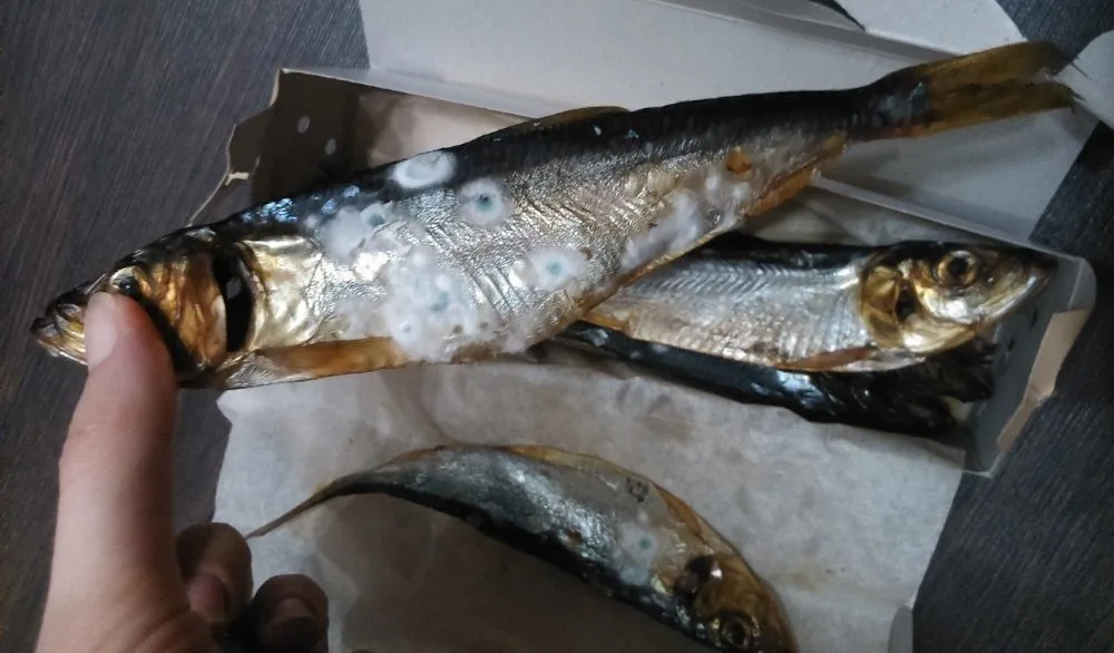 Плесень тоже выглядит как белый или черно-зеленый слой немного влажного «пуха», то есть густо ветвящихся тонких и белых нитей. Если сильно не хочется избавляться от рыбы, ее мясо еще можно спасти и съесть. Чтобы это сделать, нужно прополоскать тушку, вымыть ее в рассоле и снова пропустить через процедуру копчения.