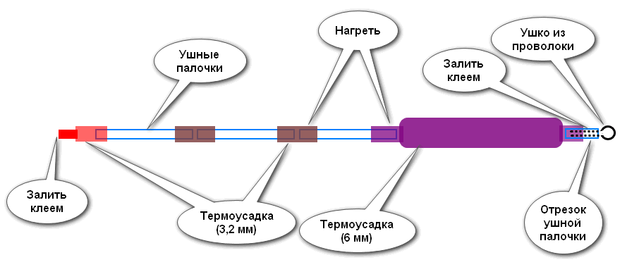- На один из концов антеннки надеваем кусочек термоусадки яркого цвета, нагреваем и обжимаем, закрепляя на кончике.